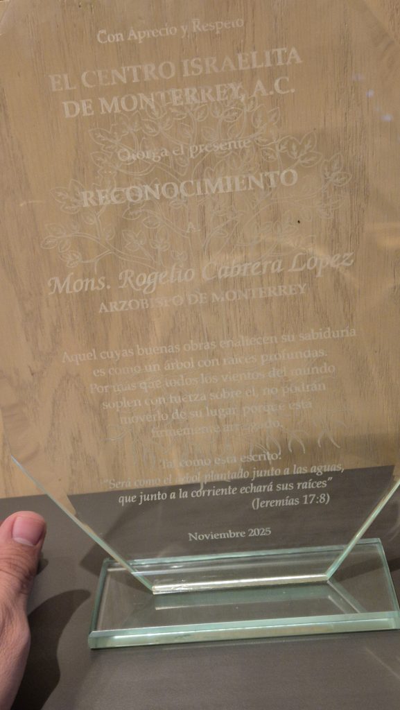 El Consejo Interreligioso del Estado de Nuevo León celebró este día una ceremonia especial en honor del Arzobispo de Monterrey, Mons. Rogelio Cabrera López, con motivo de su próximo cumpleaños número 75. El encuentro tuvo lugar este 19 de noviembre de 2025 en las instalaciones del Centro Israelita de Monterrey, reuniendo a representantes de diversos credos, autoridades civiles y miembros de la sociedad para fortalecer los lazos de diálogo y de colaboración interreligiosa y social; evento que coincide con el 60 aniversario de la declaración Nostra Aetate del Concilio Vaticano II que pide a todos los miembros de la Iglesia católica el respeto y el reconocimiento a todas las religiones, en primer lugar a los hermanos mayores de la religión judía.