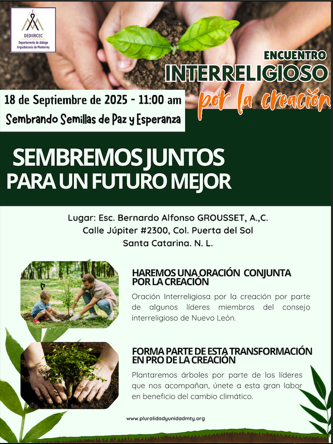 El jueves 18 de septiembre de 2025 se llevó a cabo la Jornada Interreligiosa por el Cuidado de la Creación en la Escuela Bernardo Alfonso Grousset en la Col. Puerta del Sol, en Santa Catarina, N.L. cuyo lema fue: Sembrando Semillas de Paz y Esperanza.